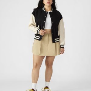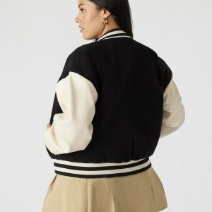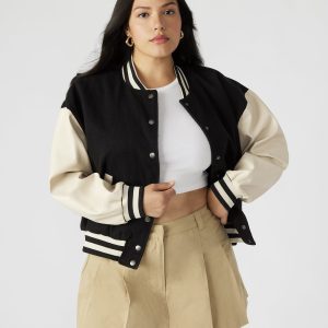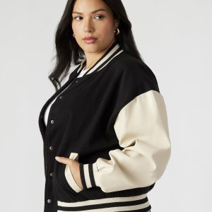 jacket with striped trim and contrast sleeves, updated with a drop shoulder for comfortable layeringÂ