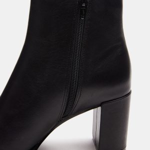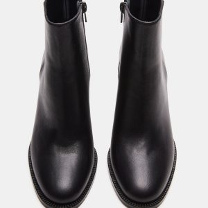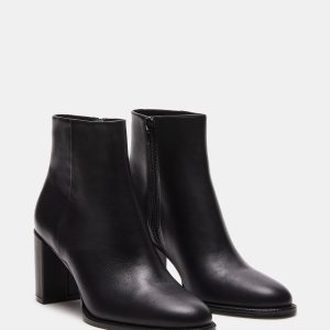 bootie is a cropped ankle height design with a sleek upper set on a matched block heel for an understated monochrome look.