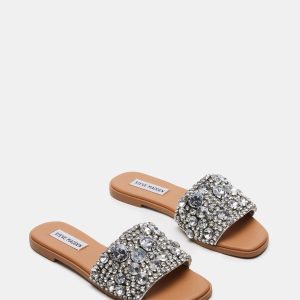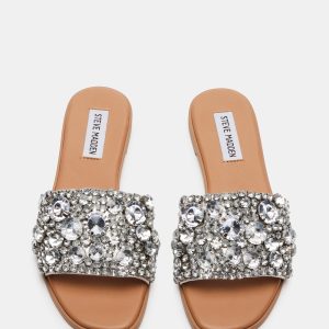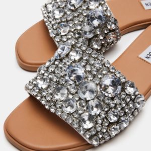sandals elevate the standard flat slide look with a wide strap encrusted with rhinestones in varying sizes for maximum shimmer.