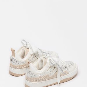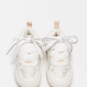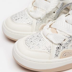 platform sneakers their signature look, with a wider set of laces crossed over the first set using cutout panels along the sides of the shoe. Rhinestone embellishment finishes the design with a touch of sparkle.