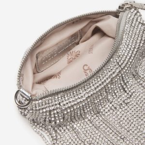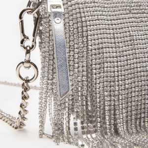 Add a touch of glamour to your outfit with our SHAKIRA bag. This elegant crossbody bag features a stunning rhinestone fringe detail and a convenient chain strap. With its top zipper closure, your belongings will stay secure wherever you go. Elevate your style with this chic accessory.