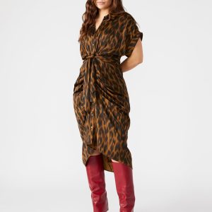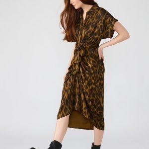 The TORI dress has a rolled collar and cuffed short sleeves, with an adjustable gathered tie-front waist and a high-low hem. The dress is finished with a washed satin texture, giving it a polished look.