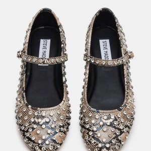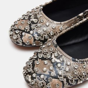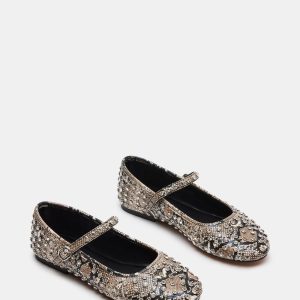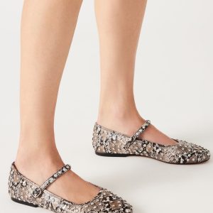 flat sole and a slim buckle strap across the top. Rhinestone studs set over the upper and along the strap add texture – and lots of sparkle – to the look.