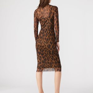 dress features a lined midi length mesh outer layer finished with a mock neck and thumbhole sleeves.